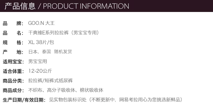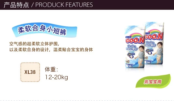 | 商品名称:保税区直发 日本大王GOO.N维E系列 男宝宝拉拉裤 XL38片 | 商品编号:1YYZ0000044 | 品牌:日本大王 |